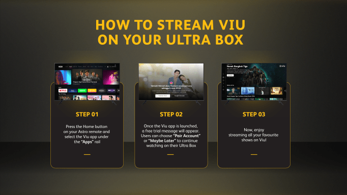 Pelanggan Astro boleh mula strim semua rancangan kegemaran mereka di Viu dengan membuka aplikasi tersebut di Ultra Box mereka. Selain itu, mereka boleh klik “Pair Account” dan ikuti langkah yang tertera di skrin untuk log masuk dengan ID mereka atau reka ID asas baharu dan pautkan akaun mereka dengan Ultra Box untuk menikmati Viu di laman sesawangnya dan aplikasi mudah alih. Kini, para pelanggan boleh menikmati Viu dengan semua peranti mereka.