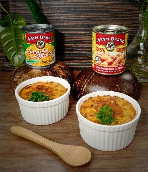 Minta anak anda untuk menggaul Kacang Panggang Ayam Brand, rempah dan telur dalam mangkuk dengan perlahan. Biarkan anak anda oleskan bahagian dalam 4 bekas muffin atau sapukan dengan mentega. Tuang campuran kacang panggang dan taburkan keju dengan banyak pada bahagian atas. Bakar dalam oven panas bersuhu 180ºC selama 20 minit sehingga keju menjadi pejal. Naikkan suku kepada 210ºC dan biarkan selama 3 hingga 5 minit sehingga keju keperangan.