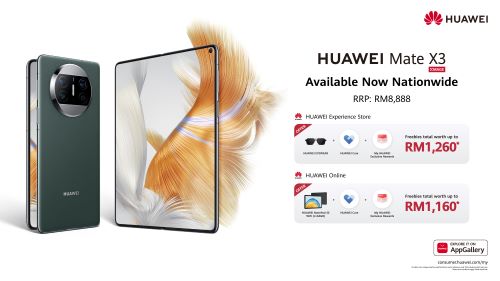 Available in Dark Green Vegan Leather and Black for RM 8,888, HUAWEI Mate X3 (12 GB RAM + 512 GB ROM) will be available nationwide starting 11 May across all HUAWEI Experience Stores, HUAWEI’s Official Website, HUAWEI Official Store on Shopee, HUAWEI Flagship Store on Lazada and authorized HUAWEI Partner Stores such as SenHeng, senQ, Harvey Norman and Urban Republic.