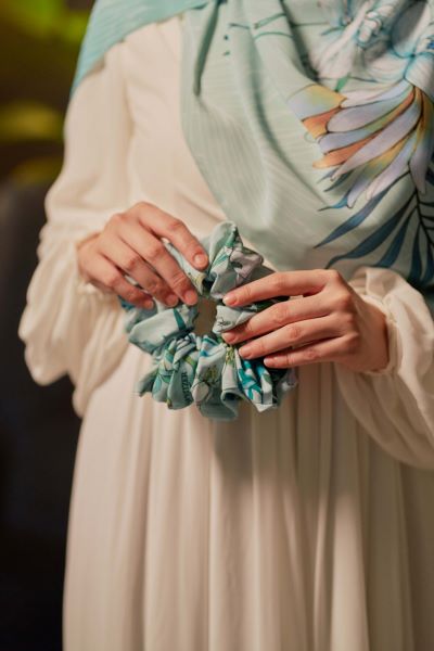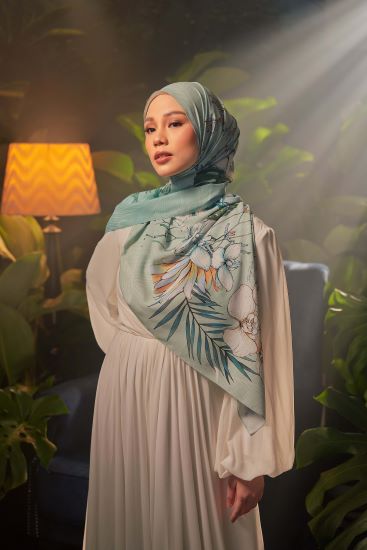 Selendang dan scrunchie (pengikat rambut) edisi terhad tersebut menggambarkan imej indah flora hutan hujan dengan warna biru firus (turquoise) sebagai latar belakangnya. Motif bunga orkid, paku-pakis dan monstera menghiasi selendang dan scrunchie sementara fabrik, dengan keseimbangan berat, menyokong bentuk selendang dan menepati wajah pemakainya. Setiap selendang datang dengan rekaan beg saku boleh diguna semula yang sepadan, bagi menyimpan selendang unik anda!