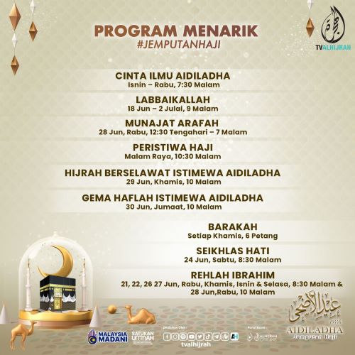 -berdurasi 2 jam akan disiarkan pada 28 Jun pukul 12.30 tengah hari hingga 7 malam. Program ini mmebawa penonton bermunajat kepada Allah dan memperingati kelebihan Hari Arafah. - Hijrah Berselawat Istimewa Aidil Adha