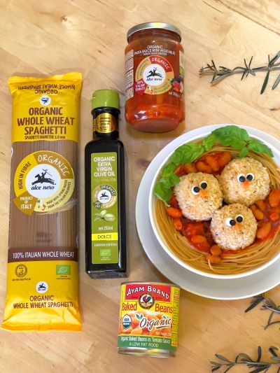 Campurkan Sos Pasta Organik Alce Nero™ bersama sayur-sayuran dengan Kacang Panggang Ayam Brand™. Tuangkan campuran itu di bahagian tengah sarang spageti dan kemudian susun bebola daging yang tersedia di atasnya. Taburkan sedikit keju jika mahu. Biarkan hidangan sejuk sedikit. Hiaskan bebola daging untuk membentuk seumpama muka burung. Taburkan daun basil sebagai hiasan sebelum dihidang.