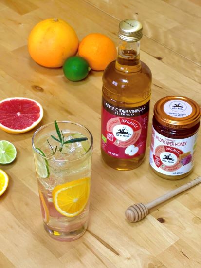 - Tuangkan satu sudu teh Cuka Epal Organik Alce Nero™ dan satu sudu teh Madu Bunga Liar Alce Nero™ di atas susunan hirisan buah tersebut