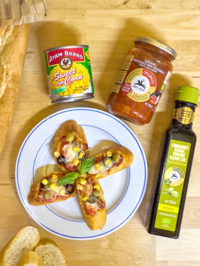 - Tambahkan parutan keju dan letakkan setiap kepingan dengan Jagung Manis Ayam Brand™, Kacang Pea Ayam Brand™, hirisan buah zaitun hitam dan tomato ceri