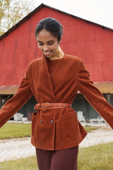 She appreciates clothes made of natural materials such as cotton and wool, and that have a durability that allows them to be worn every day. Denim, which is said to have originated in the Nîmes region of southern France, is a crucial material. Along with jeans, it is expressed through dresses, jackets, and shirts. Knitwear items have a color palette of orange and red that evokes a sense of nature.