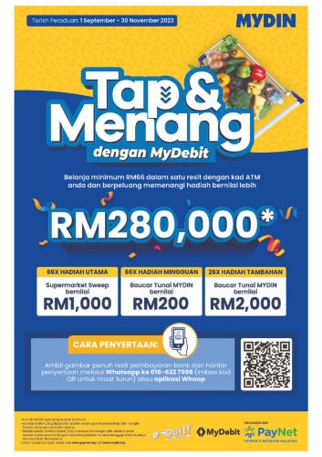 - Bagi menggalakkan penggunaan aplikasi pembayaran secara digital, pelanggan yang menggunakan MyDebit berpeluang memenangi baucar MYDIN bernilai sehingga RM280,000 bagi setiap pembelian RM66 dan ke atas dalam satu resit.