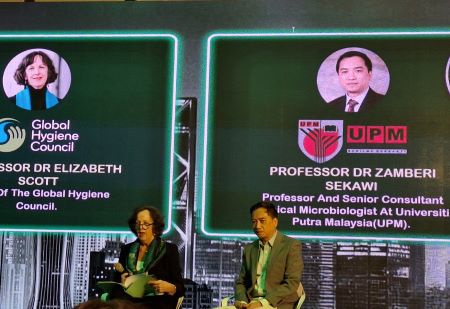 Profesor Dr Zamberi Sekawi, Pakar Penyakit Berjangkit dan Pengerusi GHC, Profesor Emerita Elizabeth Scott turut bertukar-tukar pandangan mengenai kepentingan penambahbaikan amalan kebersihan, konteks kesihatan global dan landskap kesihatan awam tempatan.