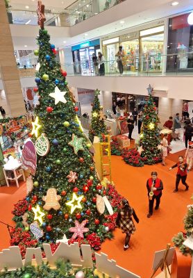 Lebih daripada satu pokok Krismas yang dihias rapi dengan aksesori begemerlapan menghiasi Aras Atrium di pusat beli-belah ini. Satu rak buku turut diletakkan di ruang ini.