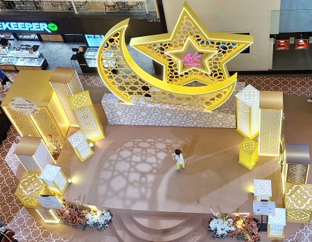 Sparkling stars, crescent moons, and gold Arabic lanterns guide your path to the spectacular centrepiece – the brightest star and crescent moon featuring Avenue K’s unmistakable logo surrounded by ornate structures featuring geometrical patterns and intricate designs in contemporary Islamic motifs.