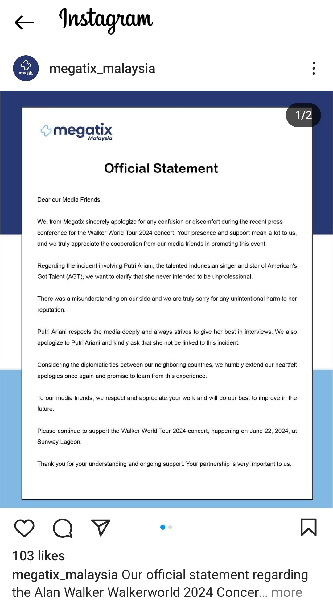 “Sekali lagi, kami dan Megatix meminta maaf mengenai insiden yang telah berlaku dan diharapkan dengan penjelasan ini, dapat membersihkan nama Puteri Ariani kerana insiden itu tidak seharusnya dipertanggungjawabkan kepada Puteri Ariani semata-mata dan adalah tidak adil untuk menyalahkan beliau kerana kesilapan komunikasi penganjur yang dilantik oleh kami.