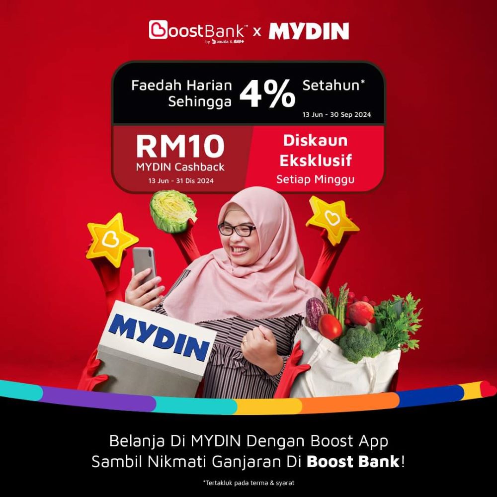 Kerjasama strategik antara MYDIN dan Boost Bank ini turut menawarkan kadar faedah harian eksklusif sehingga 4% setahun (dibayar secara mingguan) kepada pelanggan MYDIN yang membuka akaun Boost Bank, deposit sekurang-kurangnya RM2,000 ke dalam Savings Jars, dan membelanjakan minimum RM50 sebulan melalui aplikasi Boost eDompet di mana-mana cawangan MYDIN dari 13 Jun hingga 30 September 2024.