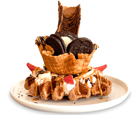 -Indulge in their specialty, King Waffle, Chocolate Belgian waffle loaded with yogurt ice cream, oreo, bananas, strawberry and many more!