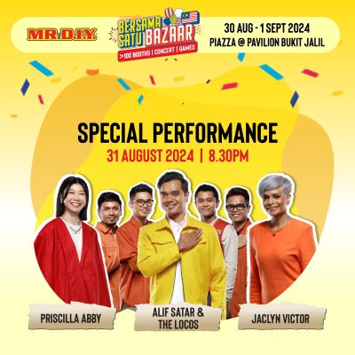 Lebih menarik lagi ialah persembahan istimewa oleh selebriti Alif Satar & The Locos, Jaclyn Victor, dan Priscilla Abby, yang akan menyanyikan secara langsung buat kali pertama lagu patriotik ‘Bersama Satu Suara’ yang diilhamkan oleh MR D.I.Y. pada 31 Ogos 2024 jam 8:30 malam.