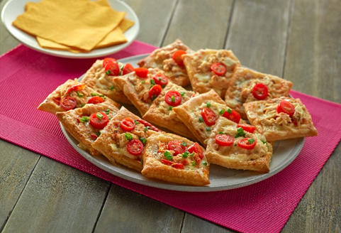 Anda perlukan satu tin Ayam Carik Mayones Ayam Brand™ dan satu tin Ayam Carik Cili Pedas Ayam Brand™, satu cawan keju cheddar parut, 20 biji tomato ceri yang dihiris, minyak zaitun dan satu pek pastri segera.