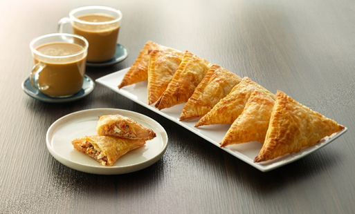 Potong pastri kepada segi empat 5 cm x 5 cm – cuba dapatkan 40 kotak. Ratakan dua sudu teh Ayam Carik Mayones Ayam Brand™ pada separuh daripada segi empat tersebut dan dua sudu teh Ayam Carik Cili Pedas Ayam Brand™ di separuh lagi.