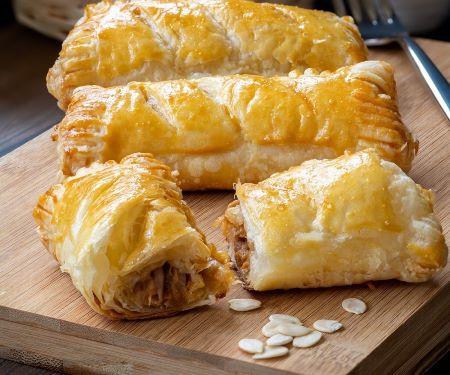 Sediakan kulit karipap dengah memotong paf pastri kepada segi empat tepat. Letakkan sedikit isi yang tersedia di bahagian tengah paf berkenaan. Lipat dan kelimkan sisi paf yang kini berbentuk segitiga. Berus bahagian atas paf dengan telur yang telah dipukul bagi mendapatkan kemasan keemas-emasan. Letakkan paf di atas bekas membakar dan masukkannya ke dalam ketuhar yang bersuhu 200°C (400°F) selama 15-20 minit atau sehingga karipap mengembung dan berwarna perang keemasan. Nikmati karipap ini ketika ia panas sebagai snek mahupun hidangan pembuka selera.