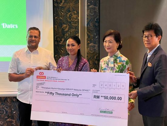 Cek sebanyak RM50,000 disampaikan kepada Puan Nor Azreen Jamaluddin, Pengerusi Alumni Keluarga SSEAYP Malaysia (SFAM) oleh Puan Ebby Loo, Pengarah Urusan Kumpulan Euro-Atlantic.