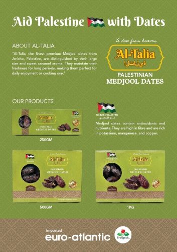 Dikenali sebagai buah ‘kurma berlian’, dibezakan dengan saiz besar dan aroma karamel yang manis, jualannya tepat pada masanya dengan menghampiri bulan Ramadan. Buah kurma Palestin ini sesuai dengan jenama “Al-Talia” yang diterjemahkan dengan indah kepada “embun dari syurga”.