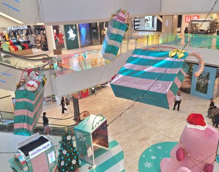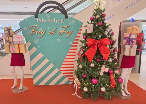 The mall is decked out in twinkling festive trees and whimsical décor, with giant Giant Bags of Joy towering above, perfect for festive selfies and fun photo ops.